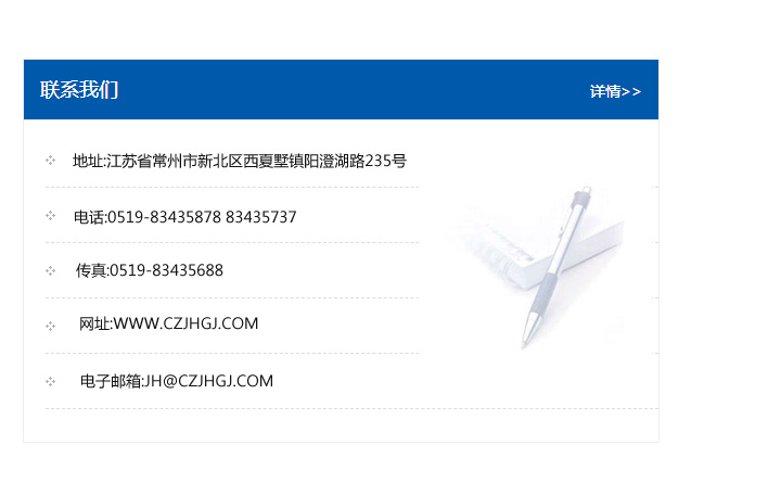 地址:常州市新北區友邦商務大廈1幢16、17層  電話:0519-85101652  傳真:0519-85112595  郵編:213022  網址:www_cz-jiayue_cn.donghuany.com  郵箱:xiajifengaa@163.com